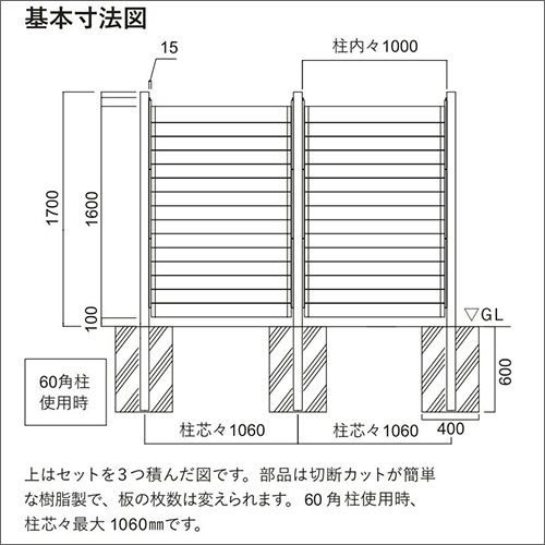 | 特徴 | プラド/プラス板材をルーバー施工する場合に柱に固定し板材のレールとして使用します。ルーバー部品1セットにつき、5枚の板材を設置出来ます。 ルーバー設置する場合は、60角アルミ支柱を使用し、柱芯々は最大1060mmです。 |
